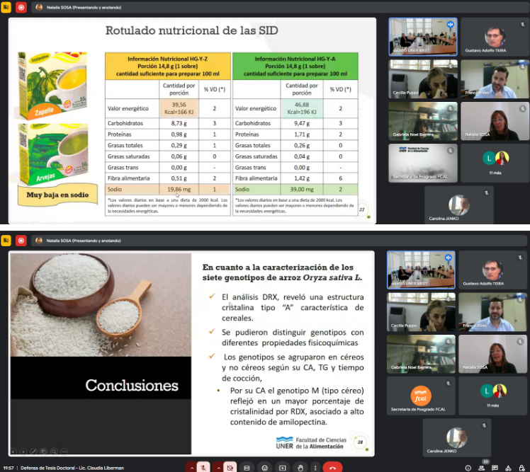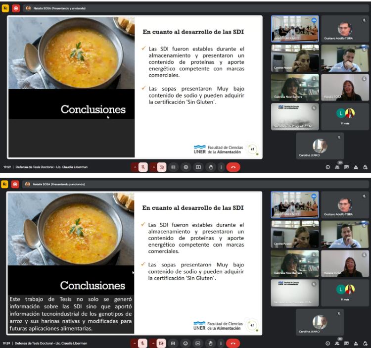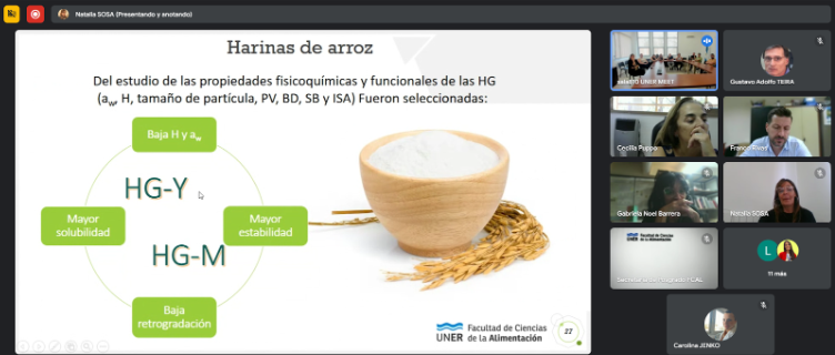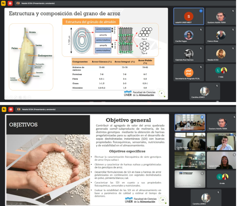 El pasado viernes 21 de marzo, se llevó adelante la defensa de la Tesis Doctoral de la Lic. Claudia Alejandra Liberman, titulada “Desarrollo de una sopa instantánea a base de un subproducto de molinería de arroz”, teniendo como objetivo general de la misma contribuir al agregado de valor del arroz quebrado generado como subproducto de molinería, de los distintos genotipos mediante la obtención de harinas pregelatinizadas para su aplicación en el desarrollo de sopas deshidratadas instantáneas (SDI) con buenas propiedades fisicoquímicas, sensoriales, nutricionales y de estabilidad en el almacenamiento.